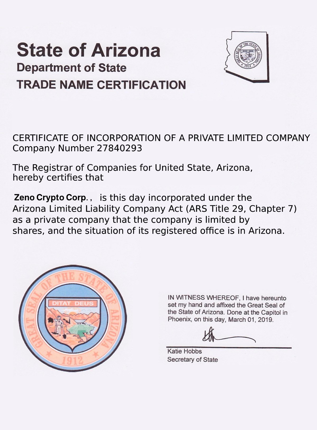 " Zeno Crypto is a legally registered company under the jurisdiction of Arizona, United States, operating in compliance with local regulatory protocols."